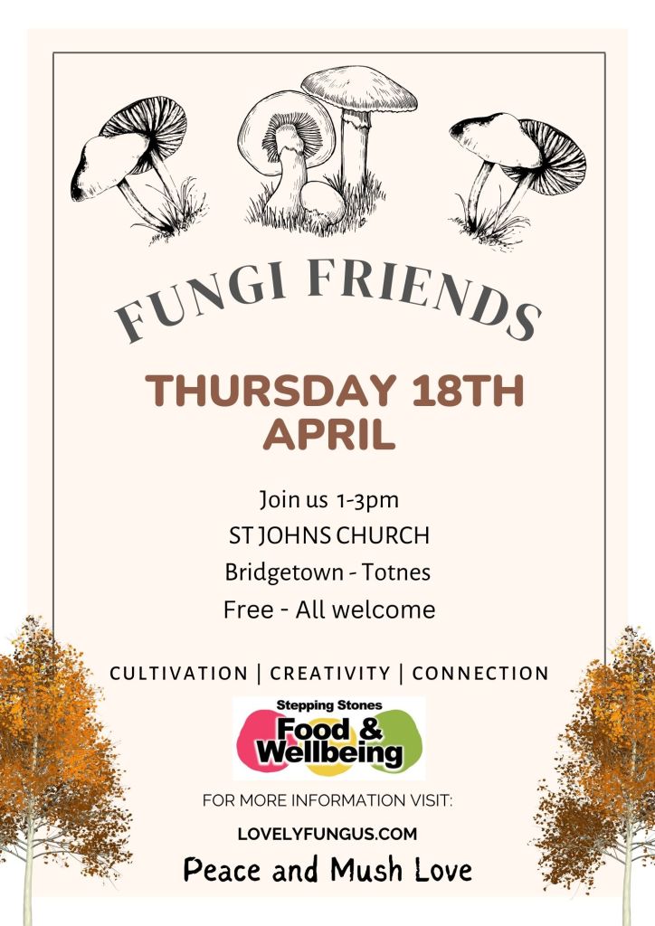 Thanks for your interest in this offering and I hope to see you on Thursday 18th April 2024 for a lovely gathering of fungi friends. We start at 1pm and finish at 3pm – you’re welcome to join at any point. Also, if you’d like to come and get some soup, a cheese toastie and whatever other tasty treats are on offer from the Stepping Stones Cafe then you’re very welcome to come along from 12 midday.